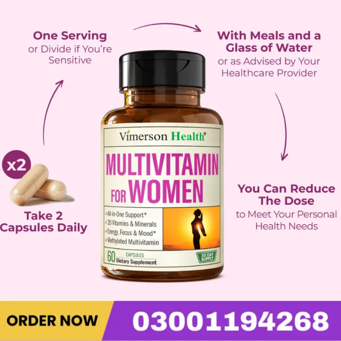 Vimerson Health Multivitamin For Women Capsules Is A Comprehensive Daily Formula Designed To Support Women’s Overall Health, Energy Levels, Immune Strength, And Beauty Wellness. Specially Crafted With Essential Vitamins, Minerals, And Targeted Nutrients, This Advanced Supplement Helps Women Maintain Balance, Vitality, And Long-term Well-being. Women Have Unique Nutritional Needs That Change With Age, Lifestyle, And Hormonal Fluctuations. Stress, Busy Routines, And Dietary Gaps Can Lead To Fatigue, Weakened Immunity, And Reduced Vitality. Vimerson Health Multivitamin For Women Is Carefully Formulated To Help Fill Those Nutritional Gaps And Provide Complete Daily Support.